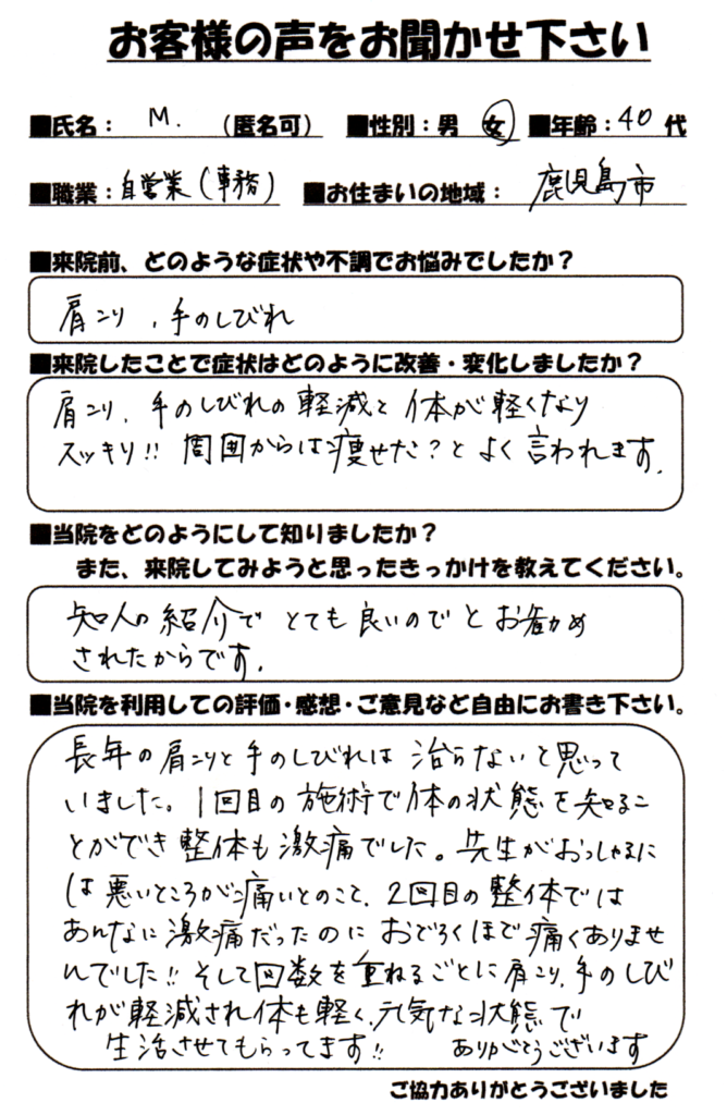 そして、回数を重ねるごとに肩こり、手の痺れが軽減され身体も軽く、元気な状態で生活させてもらっています。ありがとうございます。