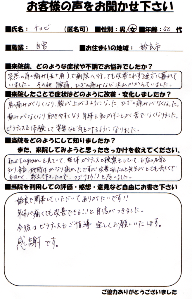 姶良市で整体、ピラティスと検索した際にお店を知り来店しました。