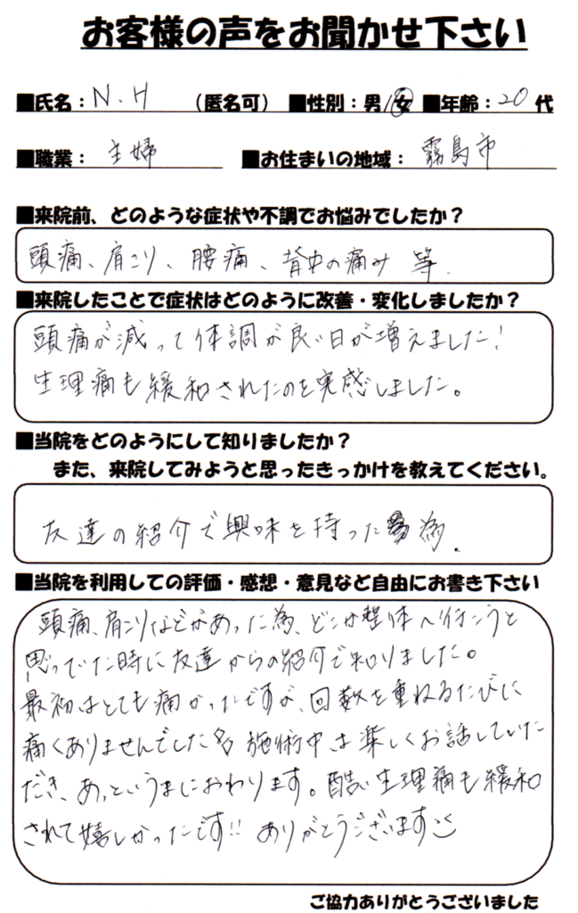 頭痛や肩こりが減って体調が良い日が増え、酷い生理痛も緩和されて嬉しかったです。