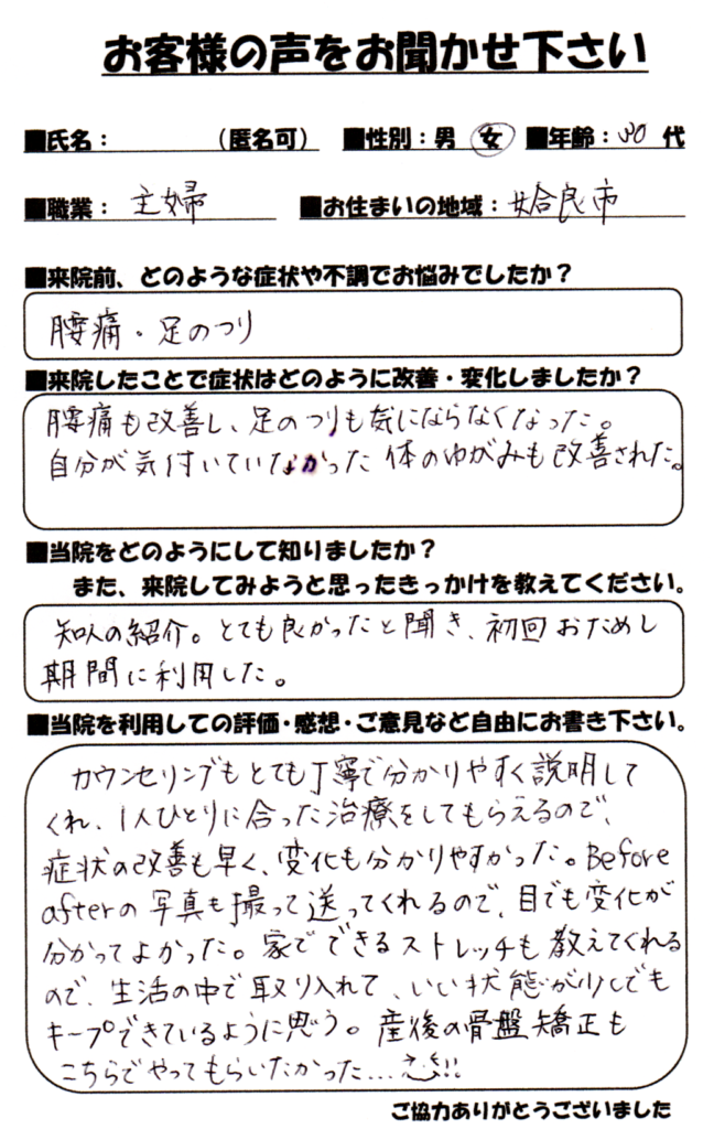 産後、慢性的な腰痛と足のつりで悩んでいる女性からの喜びの声でした。