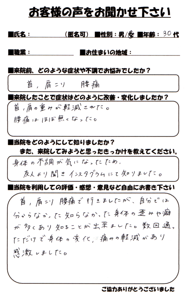 首や肩こり、腰痛で悩んでいた際に友人に教えてもらい