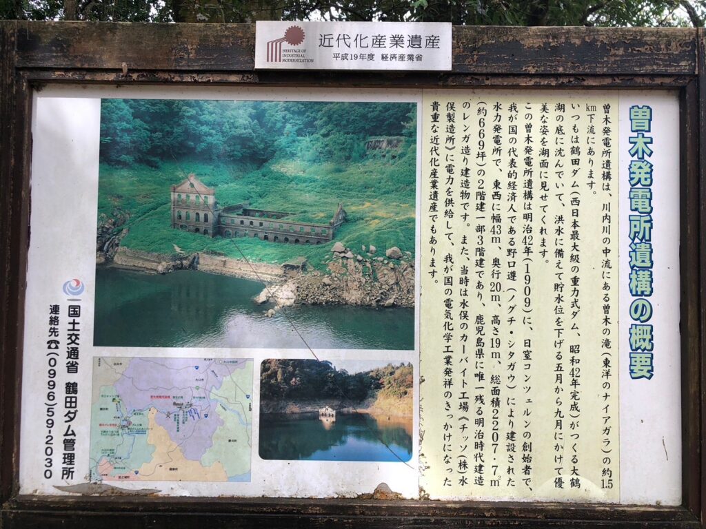創設者は野口遵で、牛尾大口金山に電力を供給するために明治39年に曽木の滝の水力を利用する電気事業を起こしました。 当時としては大規模な6,700キロワット(最大出力)の電力を作りだし、余剰電力を使い水俣ではカーバイト生産を開始。後に、戦前における日本最大の化学会社へと発展したことから、この発電所は日本化学工場発祥の地といわれています。昭和40年に鶴田ダムの完成と同時に水没してしまいましたが、現在では、渇水期の5月から9月に、中世ヨーロッパの居城跡を思わせる煉瓦造りの建物が姿を現します。