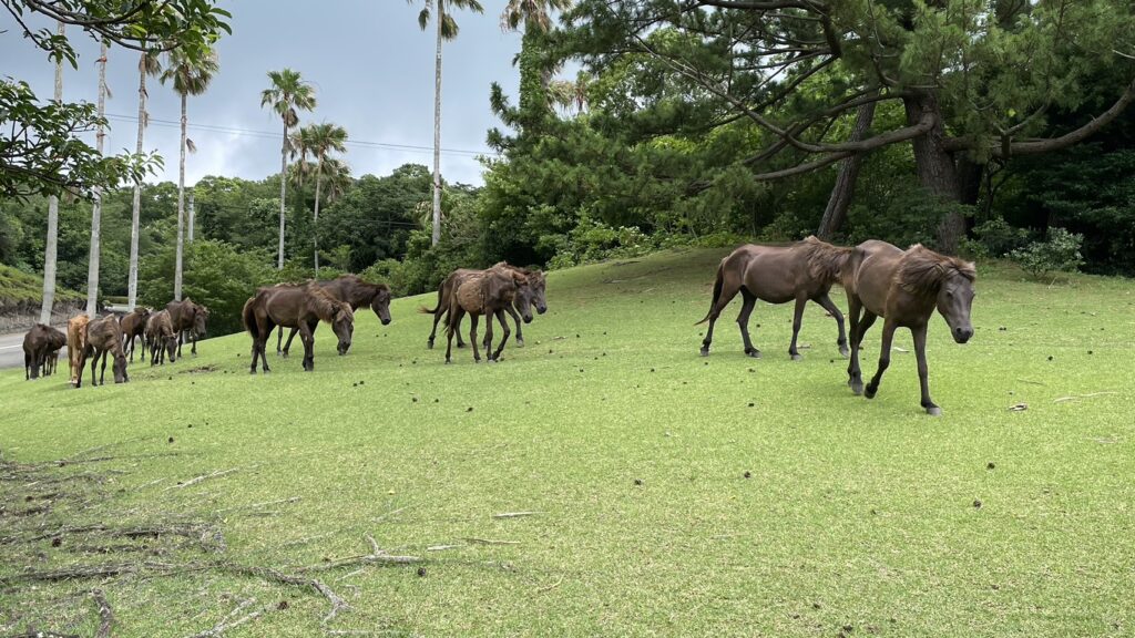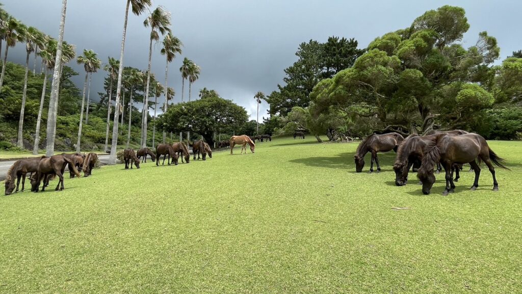 約40頭近くのトカラ馬が放牧されており、みんな雑草を食べるのに夢中でした。