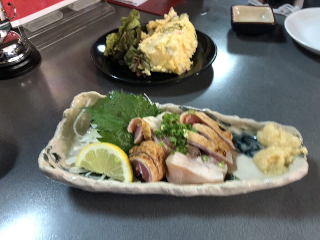 鹿児島名物の鳥刺し、ポテトサラダ。ぶれていてすみません(笑)