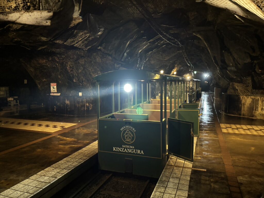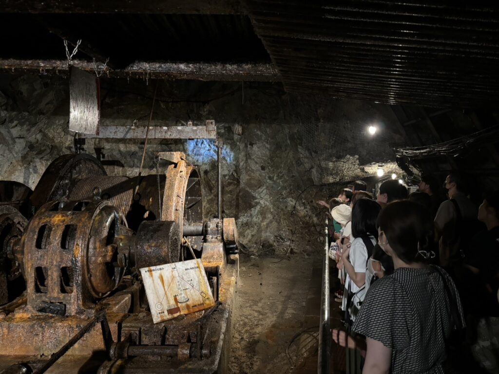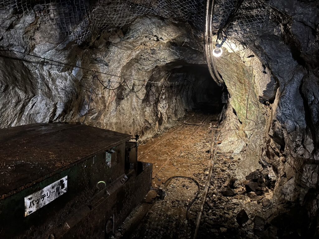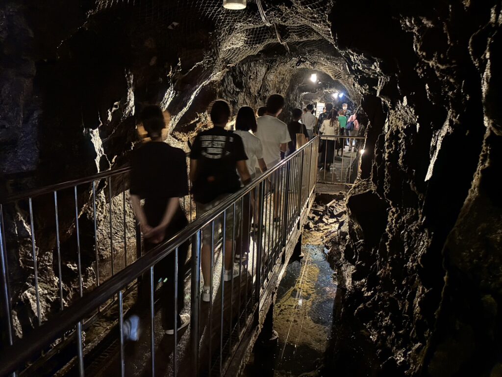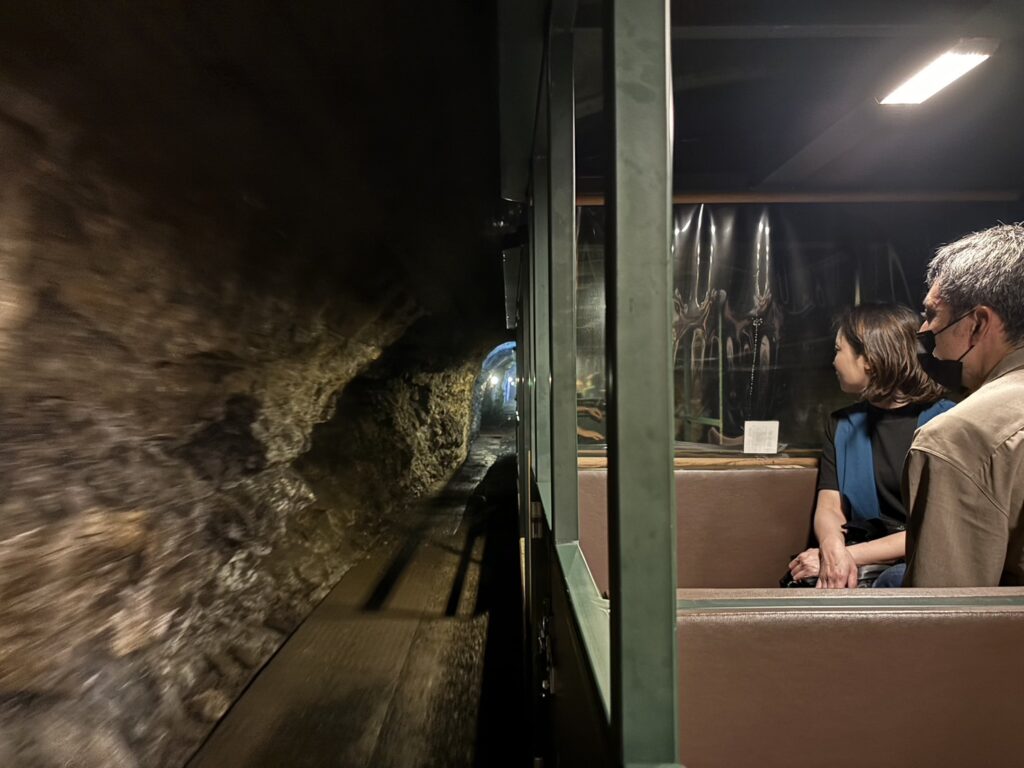 地下坑道へ着いたらガイドと一緒に焼酎蔵や金山跡を歩いて見学します。