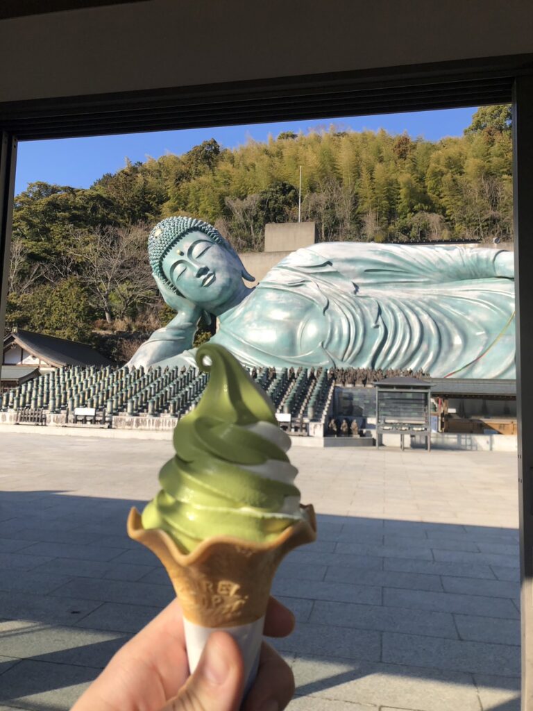 椅子に座ってソフトクリームを食べながら、釈迦涅槃像をじっくりと眺めることもできます。