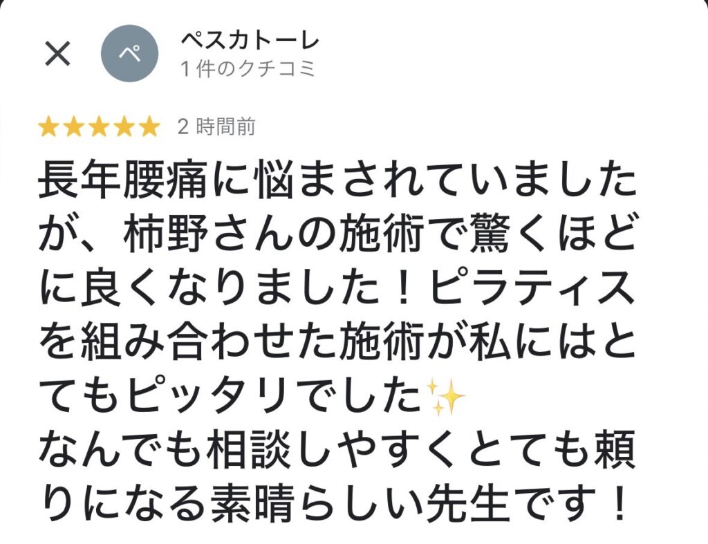 長年腰痛に悩まされていましたが、柿野さんの施術で驚くほどに良くなりました!