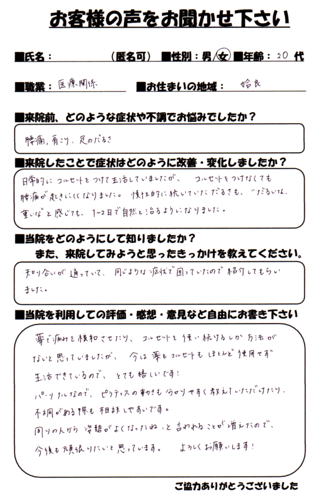 今は、薬やコルセットをほとんど使用せず生活できているので嬉しいです。