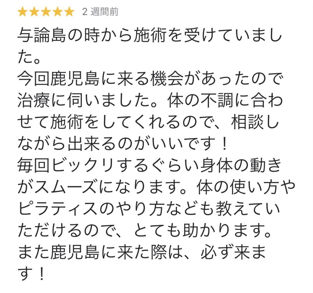 今回鹿児島に来る機会があったので治療に伺いました。体の不調に合わせて施術をしてくれるので、相談しながら出来るのがいいです!