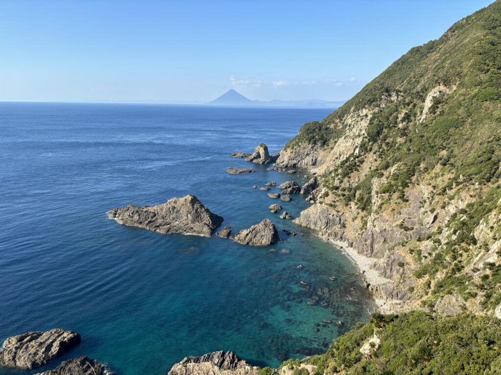 奥には薩摩半島の最南端にある「開聞岳」が見えます。