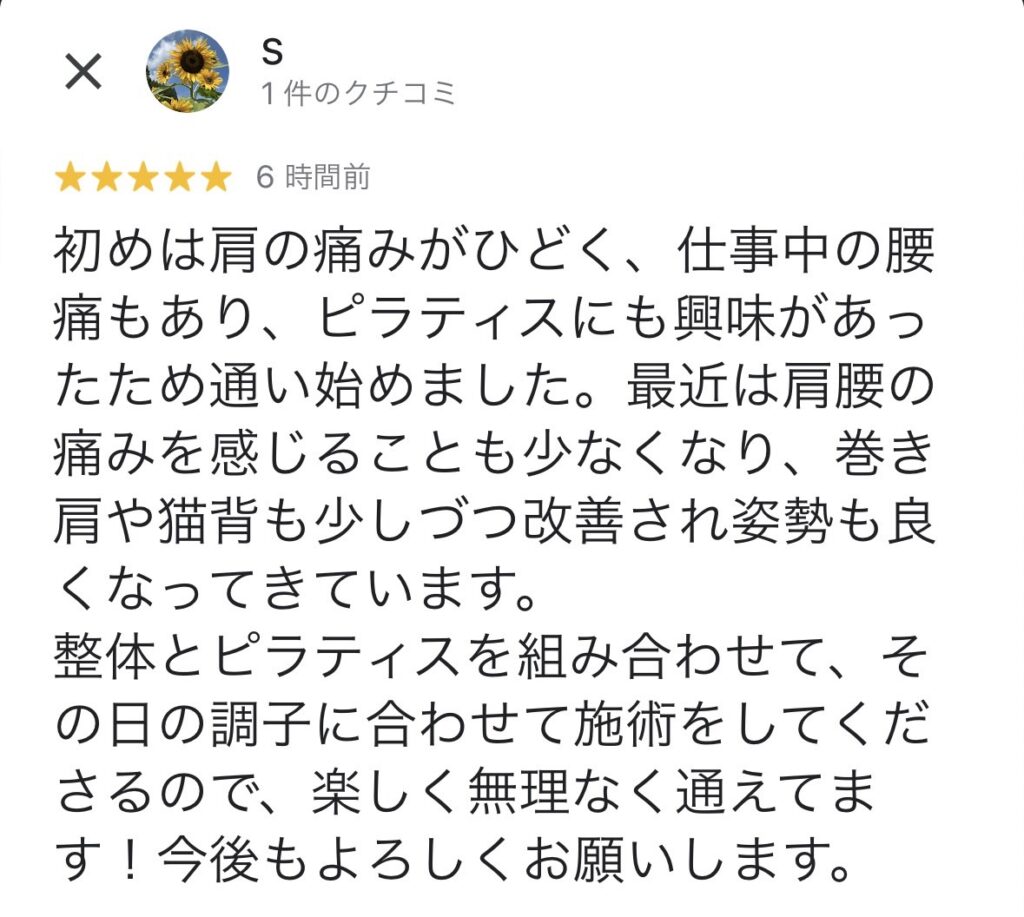 ピラティスにも興味があったため通い始めました。最近は肩腰の痛みを感じることも少なくなり、巻き肩や猫背も少しづつ改善され姿勢も良くなってきています。