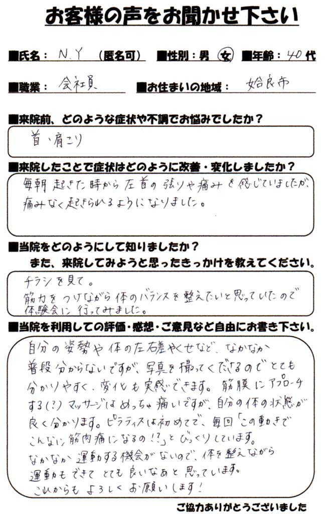 毎朝、起きるたびに首のハリや痛みを感じている時に、折込チラシをみてご来院されました。