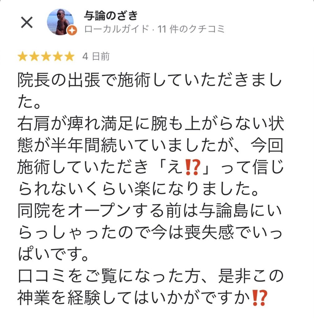 院長の出張で施術していただきました。 右肩が痺れ満足に腕も上がらない状態が半年間続いていましたが、今回施術していただき「え⁉️」って信じられないくらい楽になりました。 同院をオープンする前は与論島にいらっしゃったので今は喪失感でいっぱいです。 口コミをご覧になった方、是非この神業を経験してはいかがですか⁉️