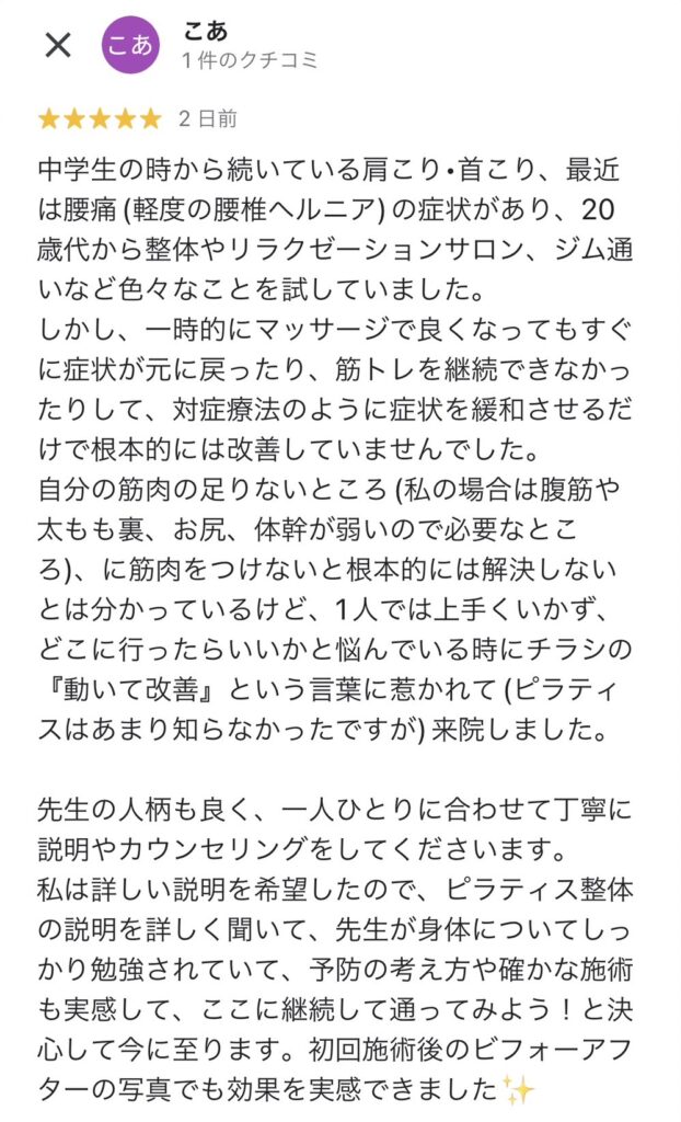 私は詳しい説明を希望したので、ピラティス整体の説明を詳しく聞いて、先生が身体についてしっかり勉強されていて、予防の考え方や確かな施術も実感して、ここに継続して通ってみよう!と決心して今に至ります。初回施術後のビフォーアフターの写真でも効果を実感できました✨