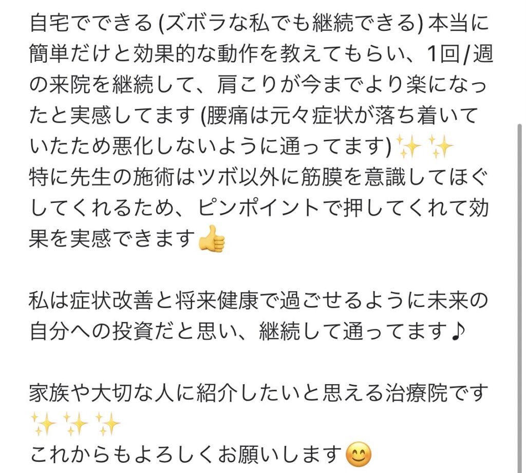 自宅でできる(ズボラな私でも継続できる)本当に簡単だけと効果的な動作を教えてもらい、1回/週の来院を継続して、肩こりが今までより楽になったと実感してます(腰痛は元々症状が落ち着いていたため悪化しないように通ってます)✨✨