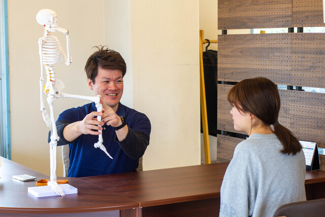 STEP5説明「なぜ不調が起きてしまっているのか?」、「お客様の今の身体はどのような状態なのか?」、骨模型やiPadを用いて説明させていただき、原因と解決策について、わかりやすく丁寧に説明します。